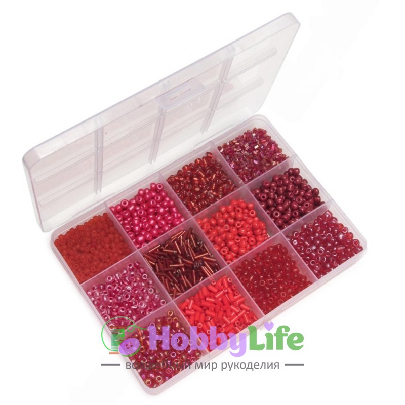 В комплекте вы найдете всё необходимое для создания украшений и декора: бисер 6/0, стеклярус и плоские бусины диаметром 6 мм. Каждый вид бисера расфасован в удобные отсеки пластикового органайзера размером 13,5×9,5×2 см, что позволяет хранить материалы аккуратно и защищает их от рассыпания, пыли и влаги. Вес каждого вида бисера — около 10 грамм.