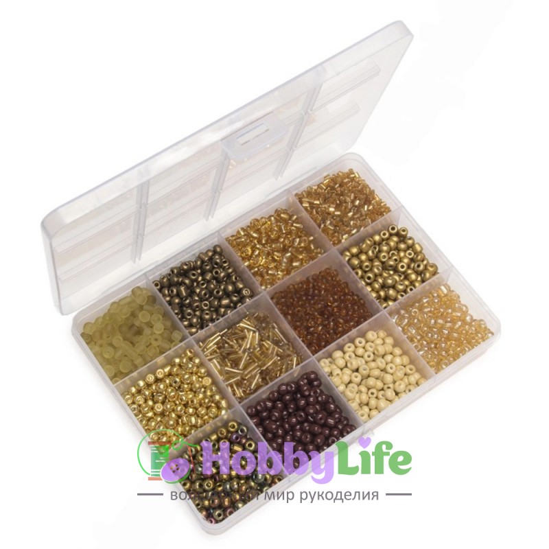 В комплекте вы найдете всё необходимое для создания украшений и декора: бисер 6/0, стеклярус и плоские бусины диаметром 6 мм. Каждый вид бисера расфасован в удобные отсеки пластикового органайзера размером 13,5×9,5×2 см, что позволяет хранить материалы аккуратно и защищает их от рассыпания, пыли и влаги. Вес каждого вида бисера — около 10 грамм.