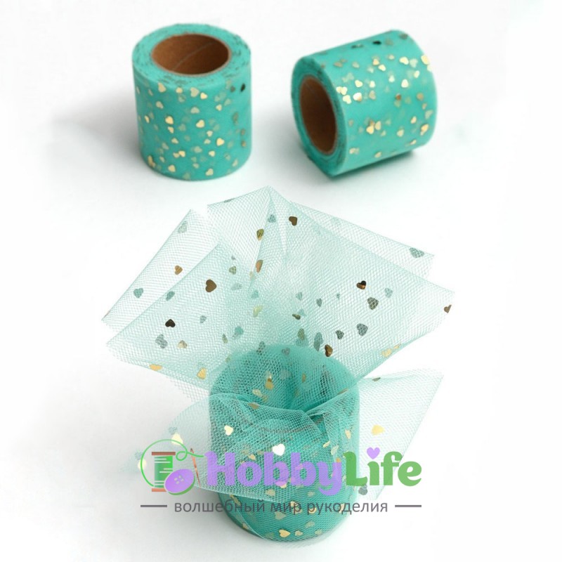 - Фатин "Сердечки" 5,5 см (1 м), аквамариновый/золото