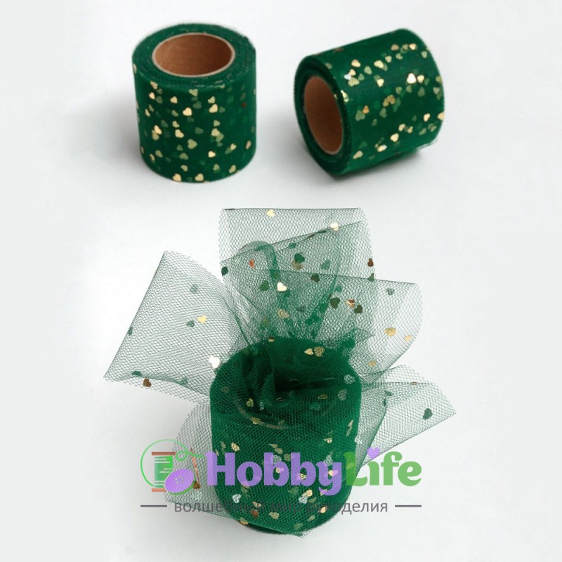 Фатин "Сердечки" 5,5 см (1 м), темно-зеленый/золото