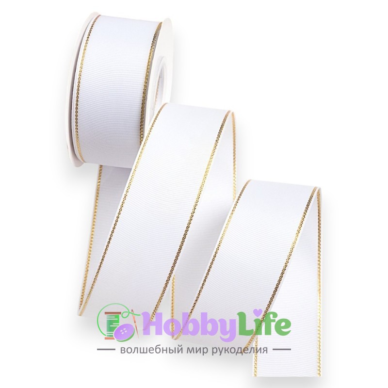 - Лента репсовая с люрексом 4 см*18 м, белый/золото №01