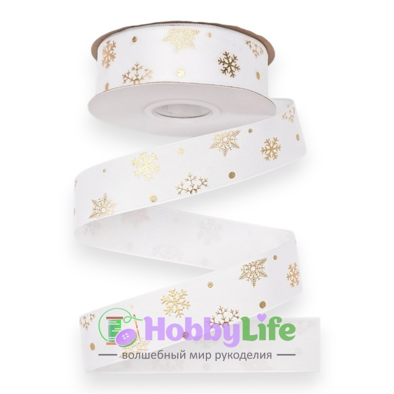 - Лента атласная 2,5 см*18 м "Снежинки", белый/золото №01