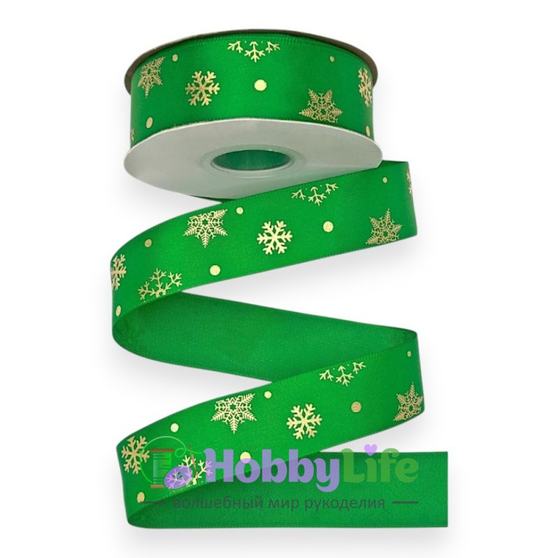 - Лента атласная 2,5 см*18 м "Снежинки", зеленый/золото №076