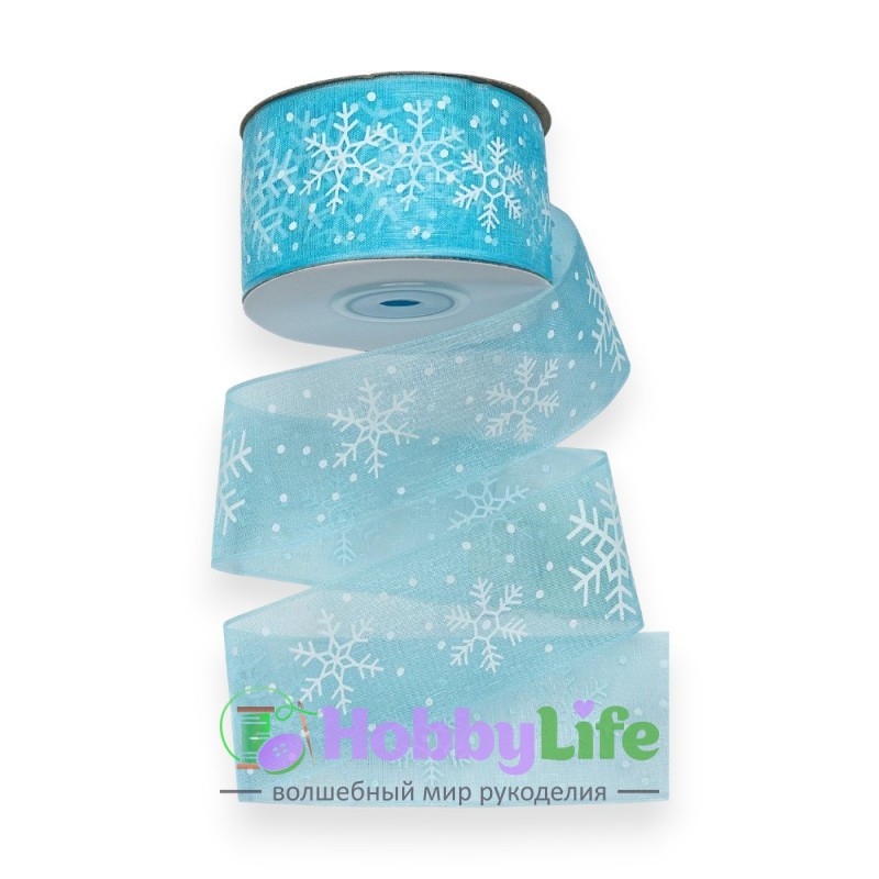 - Лента органза 4 см*23 м "Снежинки", голубой №1093
