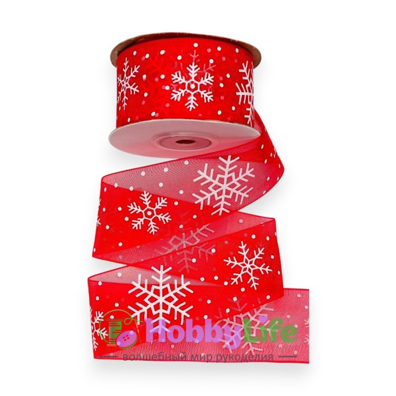 - Лента органза 4 см*23 м "Снежинки", красный №1026