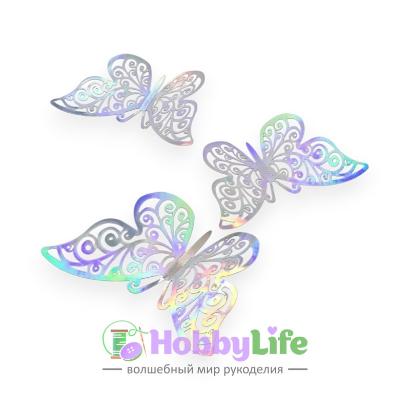 - Бабочки декоративные 3D (12 шт), серебро голографик №9