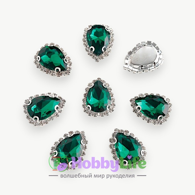 - Стразы пришивные в серебряной оправе 17*23 мм "Капля" (1 шт), изумрудный