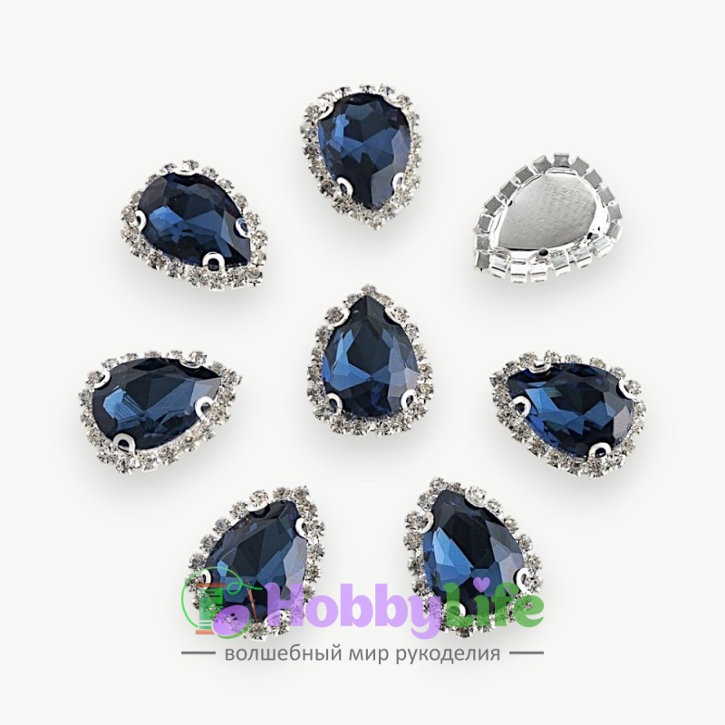 - Стразы пришивные в серебряной оправе 17*23 мм "Капля" (1 шт), темно-синий