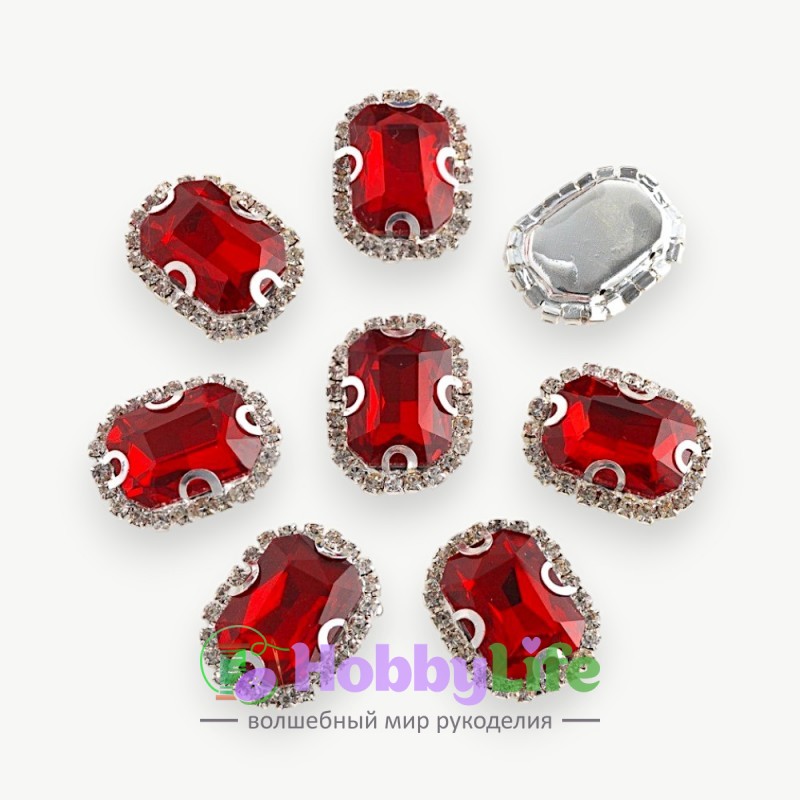 Стразы пришивные в серебряной оправе 18*24 мм "Прямоугольник" (1 шт), красный