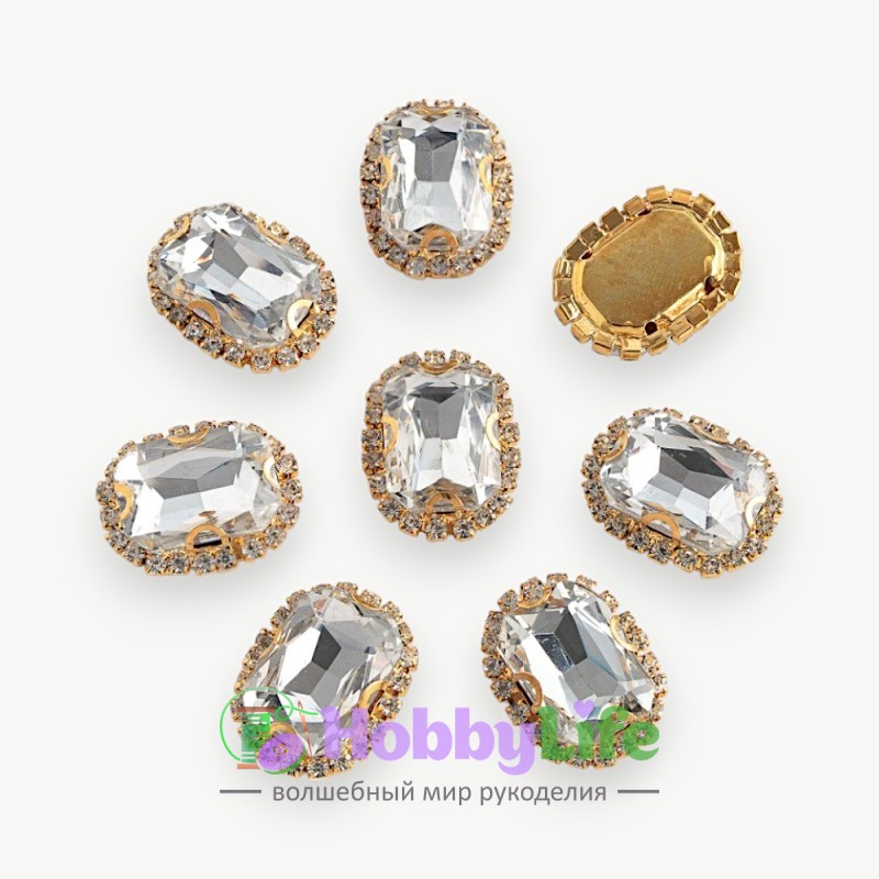 Стразы пришивные в золотой оправе 18*24 мм "Прямоугольник" (1 шт), серебро