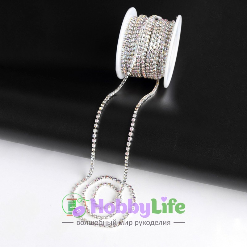 Стразы в бобине SS8М 2,4 мм*9 м, серебро хамелеон в серебряной оправе